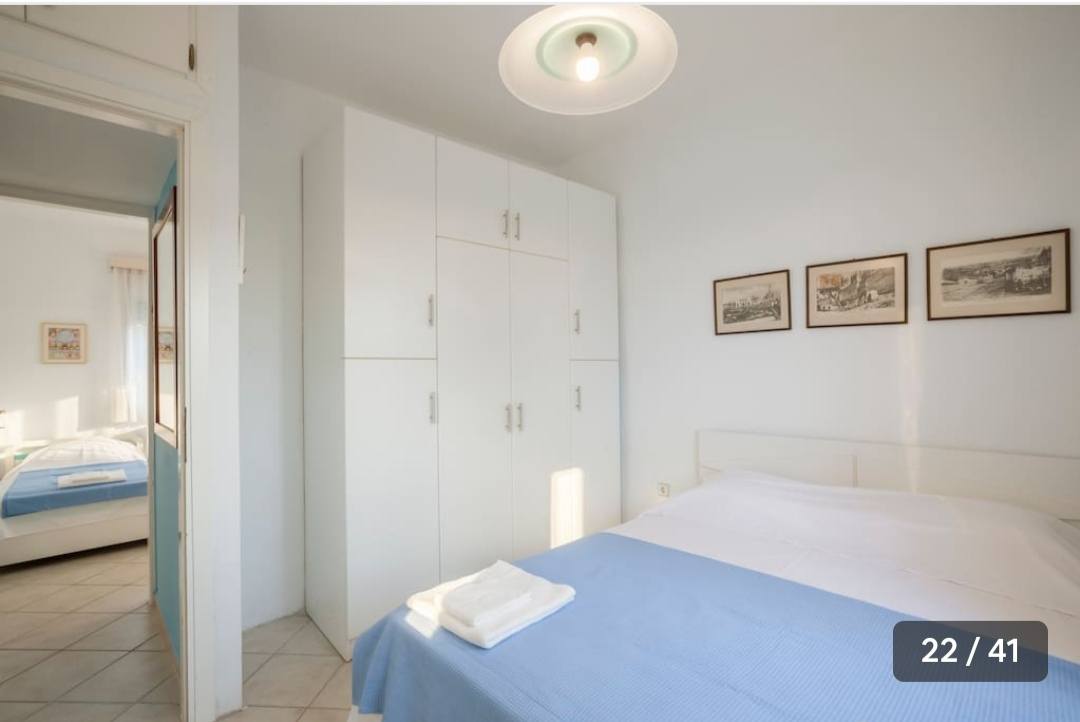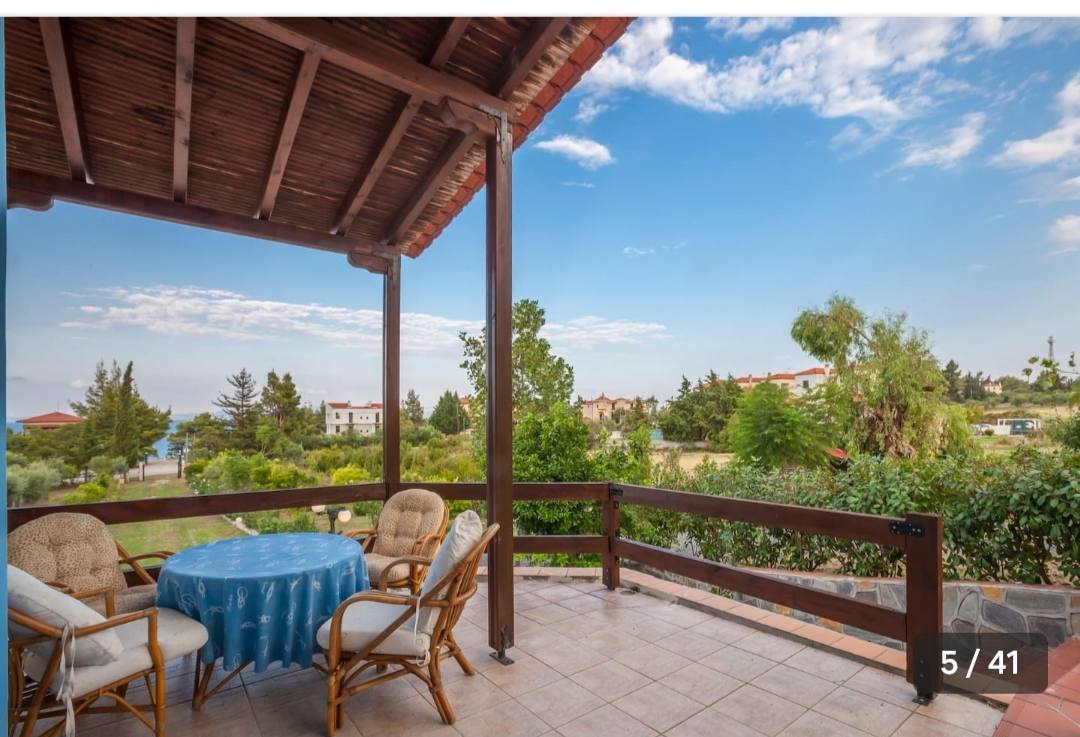Ο επάνω όροφος αποτελεί μια ιδανική επιλογή για όσους επιθυμούν άνεση και όμορφη θέα στη θάλασσα. Διαθέτει τρία δίκλινα υπνοδωμάτια, σαλόνι με καναπέδες που μετατρέπονται σε κρεβάτια και ένα μπάνιο, φιλοξενώντας έως και 10 άτομα.